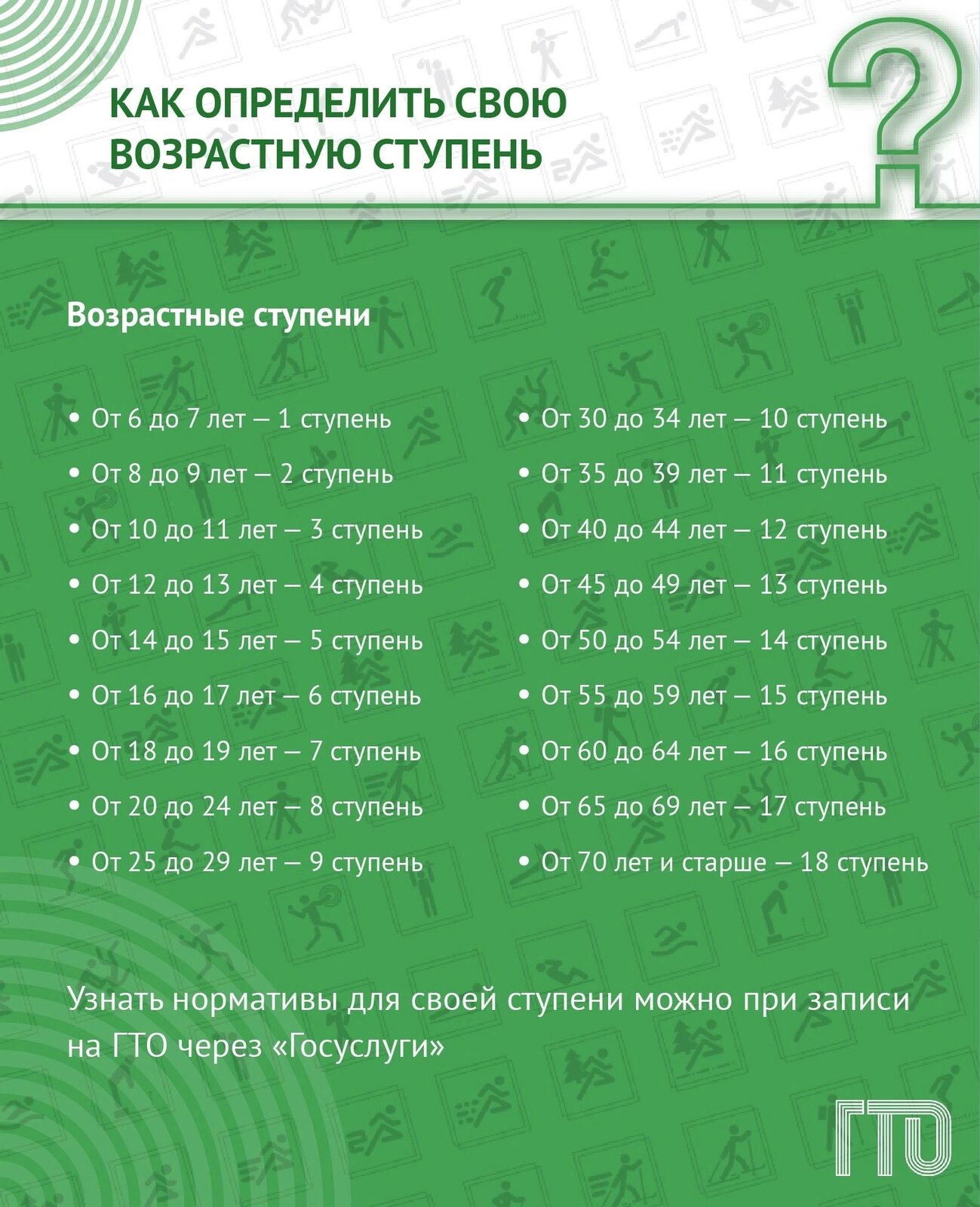 Комплекс ГТО предусматривает подготовку к выполнению и непосредственное выполнение населением различных возрастных групп (от 6 до 70 лет и старше) установленных нормативных требований по трем уровням трудности, соответствующим золотому, серебряному и бронзовому знакам отличия «Готов к труду и обороне» (ГТО).