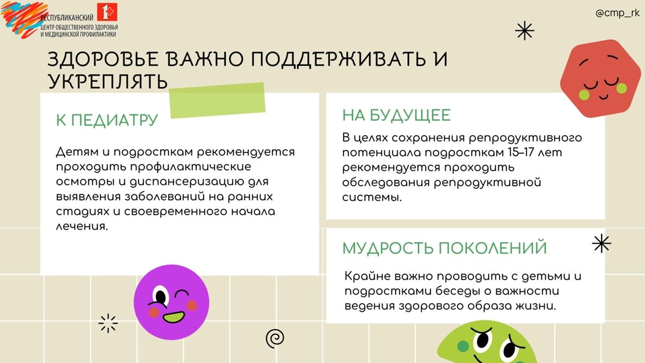 Здоровье важно поддерживать и укреплять. В этих целях детям и подросткам рекомендуется проходить профилактические осмотры и диспансеризацию для выявления заболеваний на ранних стадиях и своевременного начала лечения. Здоровье подрастающего поколения – это будущее здоровье всей страны. В целях сохранения репродуктивного потенциала подросткам 15–17 лет рекомендуется проходить обследования репродуктивной системы. Крайне важно проводить с детьми и подростками беседы о важности ведения здорового образа жизни.